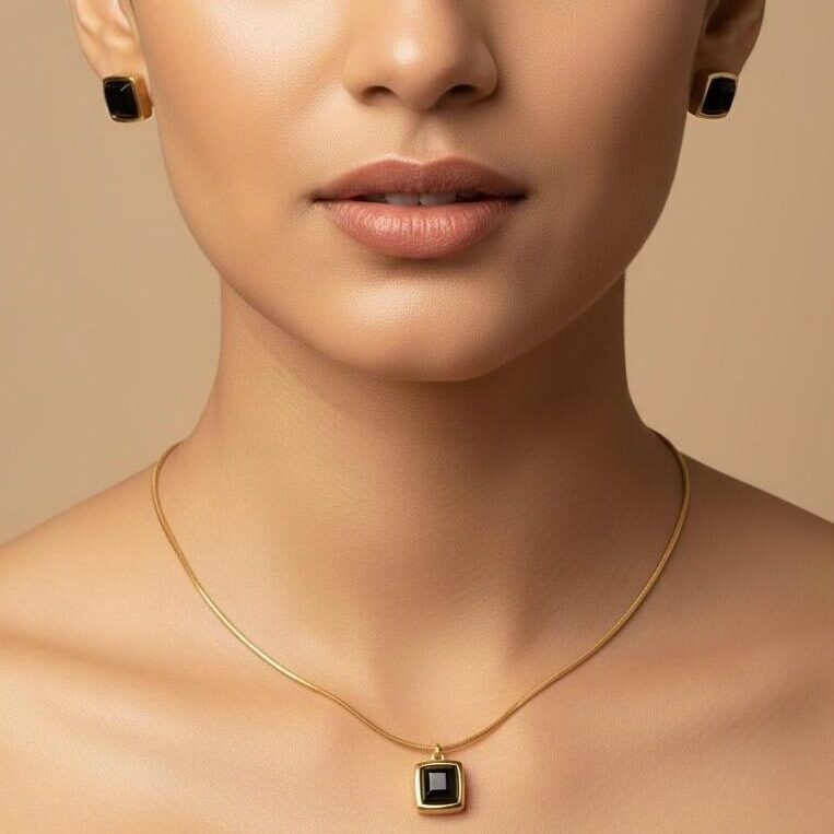 The Minimal Black Drop Pendant & Stud Earrings Set offers a clean and modern look for everyday wear. It features a smooth black drop pendant with matching stud earrings in a soft gold finish.