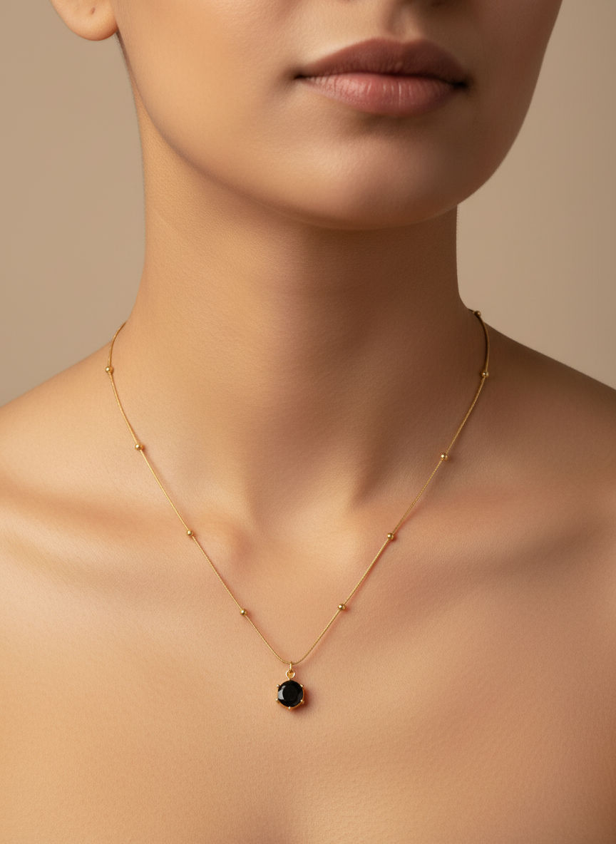 The Dainty Black Gemstone Solitaire Necklace for Women offers a soft and understated charm for everyday wear. This neckpiece features a small black gemstone set as a solitaire pendant, suspended from a fine chain with evenly spaced bead details.
