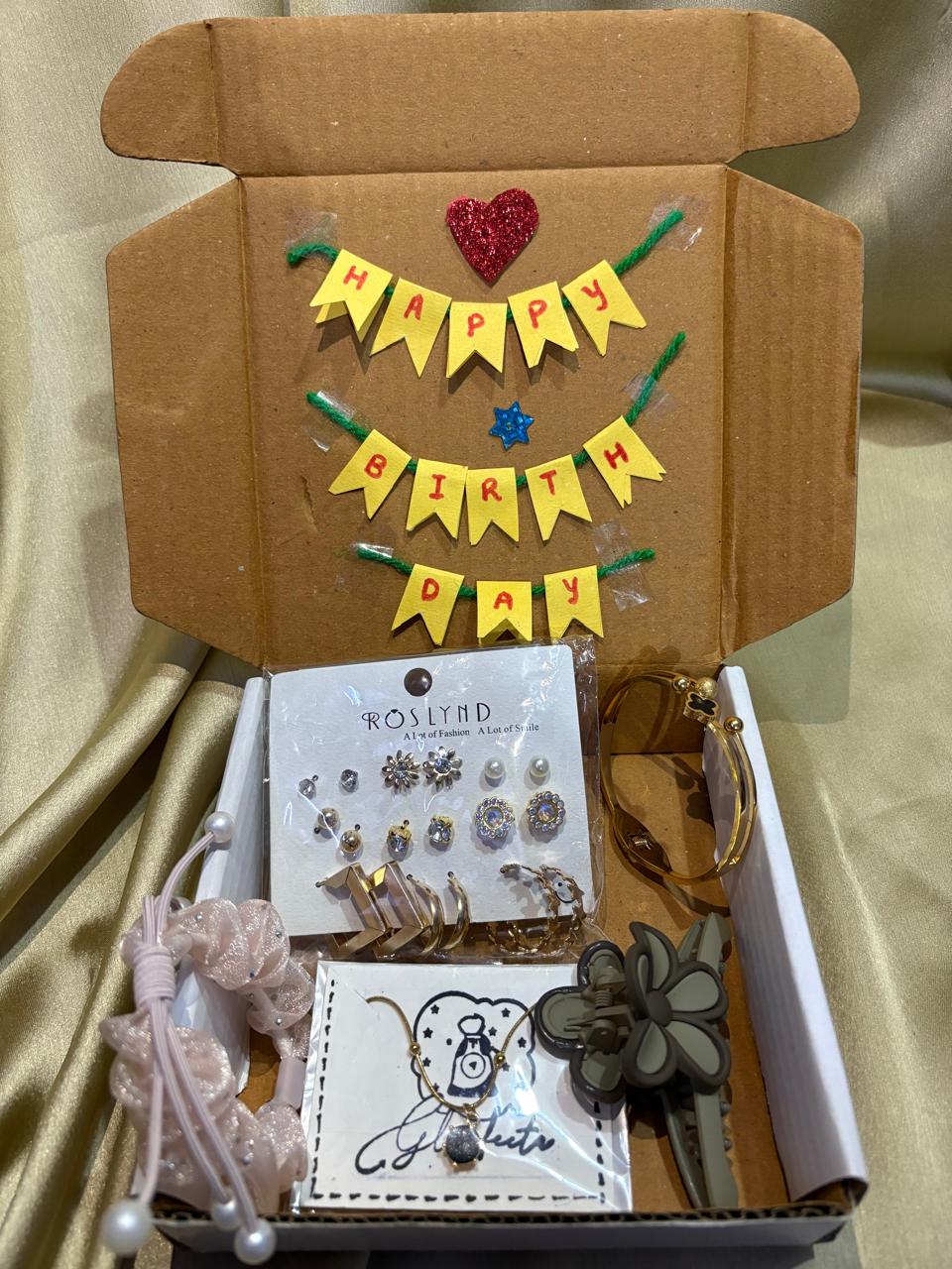 Make birthdays extra special with this beautifully curated Gleefecta Birthday Special Gift Hamper. Designed as a complete fashion combo, this set includes 9 stylish earrings card for multiple looks, an elegant anti-tarnish neckpiece, a matching anti-tarnish bracelet, a trendy big hair clutcher and a designer rubber band for daily styling