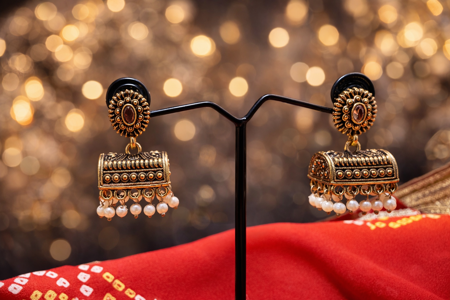 These Antique Finish Rectangular Pearl Jhumka Earrings stand out with their structured rectangular jhumka silhouette, beautifully detailed with traditional motifs. The antique finish enhances the vintage charm, while soft pearl drops add graceful movement. Moreover, the compact yet statement design makes them perfect for festive occasions, weddings, and elegant ethnic styling. Pair them effortlessly with sarees, suits, or lehengas for a timeless look.